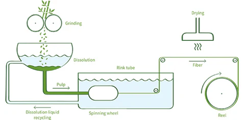 Nakon žetve, bambus se reže na trake i komadiće. Oni se zatim drobe kako bi se dobila bambusova pulpa, koja se potom pere kako bi se dobila duga vlakna. To su vlakna koja predemo, sušimo i od njih pravimo bambusove kolute.