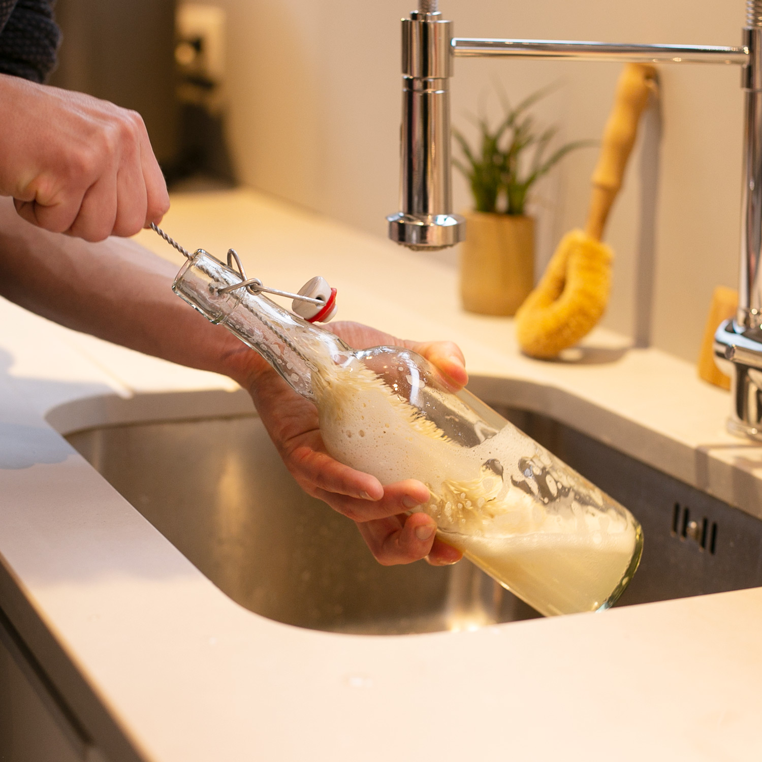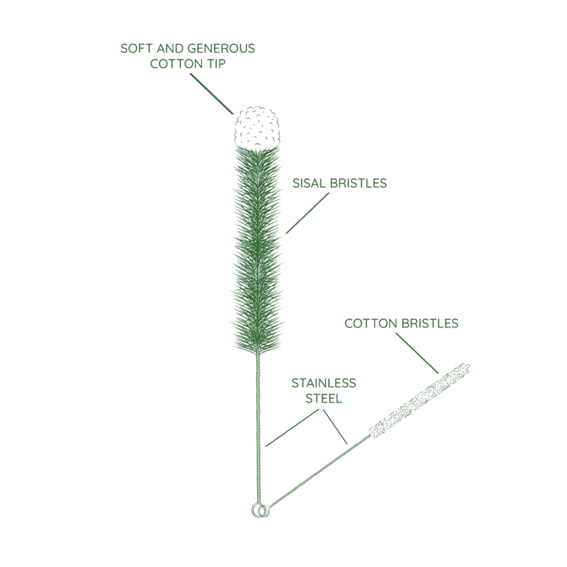 Potpuni set četkica za boce potpuno je bez plastike. Sastoji se od drške od nehrđajućeg čelika, sisal čekinja i mekog pamučnog vrha kako bi se izbjegle ogrebotine. Sisal se dobiva iz biljke agave i potpuno je prirodan, veganski resurs. Žica od nehrđajućeg čelika je jaka, ali fleksibilna. Možete je lako saviti i vratiti u prvobitni oblik kako biste dosegli sva područja svog staklenog posuđa.