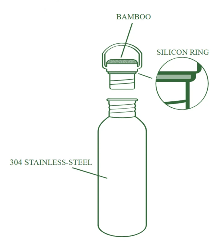 Nehrđajući čelik 304 koristi se za sve dijelove koji su u kontaktu s tekućinom. Nehrđajući čelik 304 idealan je za boce jer je otporniji na koroziju od nehrđajućeg čelika 204 ili 201, na primjer. Nadalje, za razliku od nekoliko vrsta čelika ili čak plastike, vaša posuda ne sadrži mikroplastične komadiće.