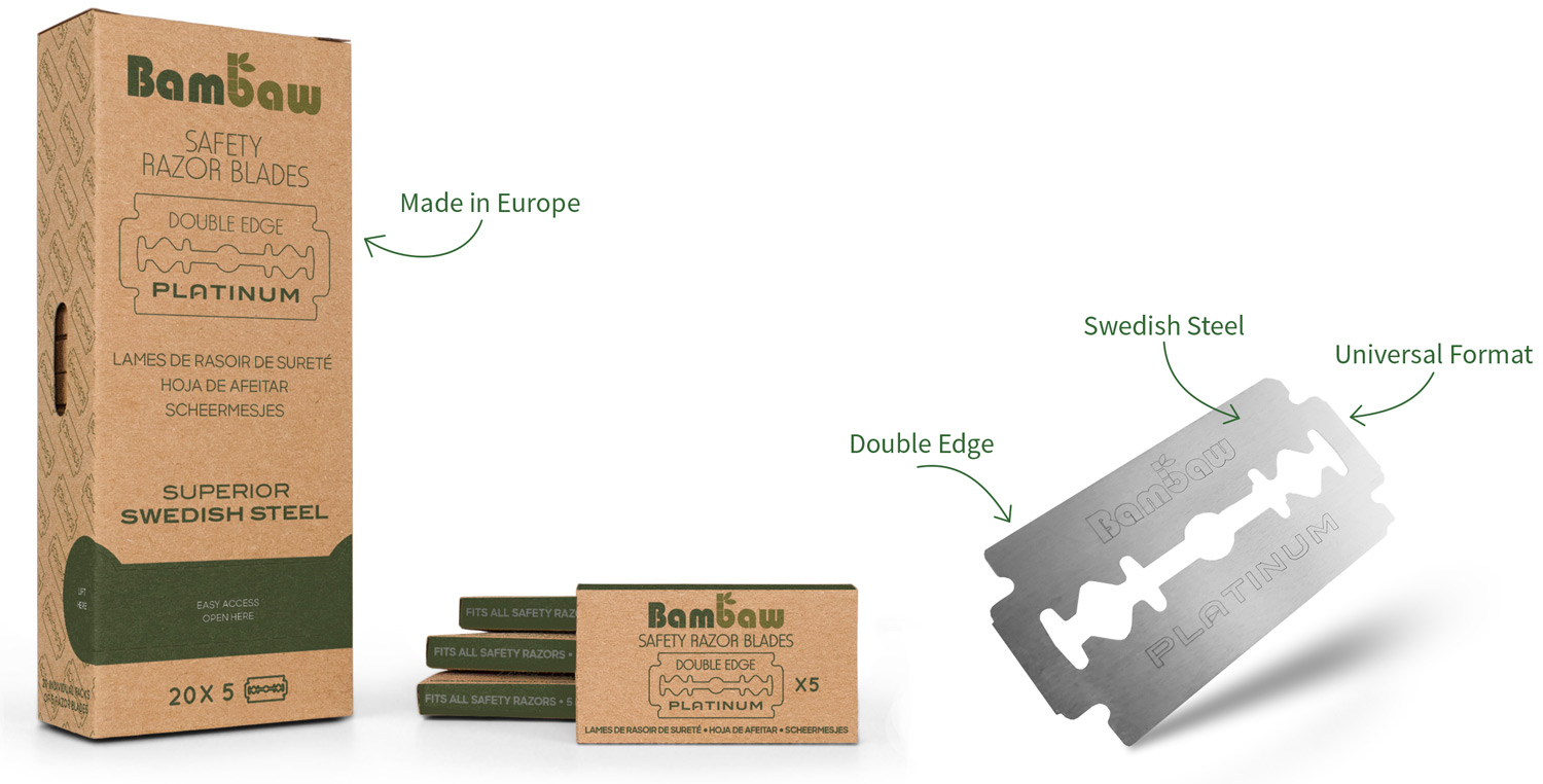 Bambaw britve s dvostrukom oštricom pružaju temeljito brijanje za muškarce i žene. Univerzalne oštrice odgovaraju svakoj sigurnosnoj britvici i prikladne su za sva područja tijela, od glave do pete.